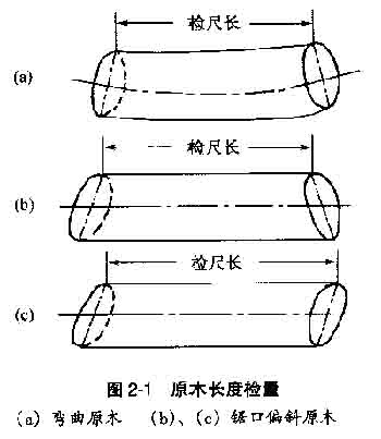 。1)長度檢量 ①檢量方法:長度檢量是在原木小頭斷面至大頭斷面之間相距最短處取直檢量。檢量時,量至厘米,不足厘米者四舍五入取整。 檢量彎曲原木、鋸口偏斜原木的長度時,均是量取兩頭斷面間的最小距離(圖2-l)。