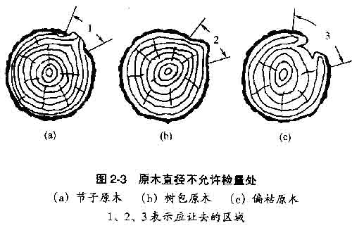 在某些特殊情況下,檢量原木直徑應注意: a.不允許在節(jié)子、樹包及凹陷處檢量,應讓去該部位(圖2-3)。